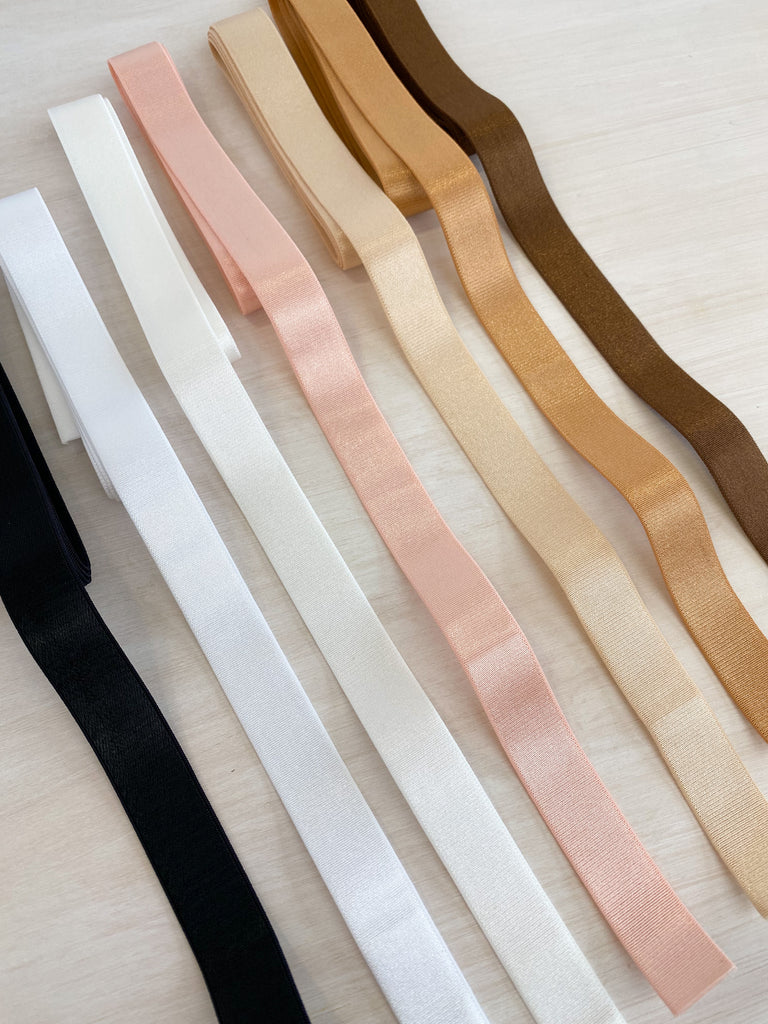 Our strap elastic is a bra making essential. Low-stretch and perfect for supportive bra straps, with a simple satin finish on the right side and plush on the reverse. Custom-dyed in our core colours to match all of our supplies including the matching sliders & rings to create adjustable straps.