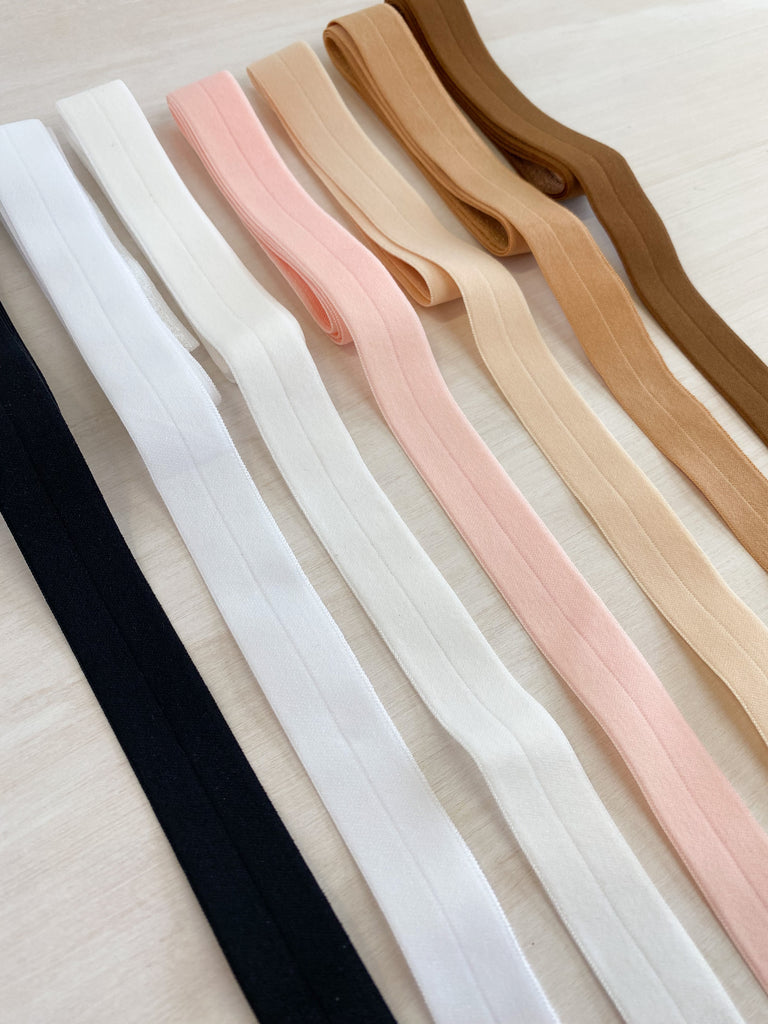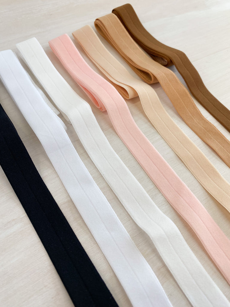 Our classic Fold Over Elastic is the perfect elastic for a soft clean finish on the edge of your lingerie. This elastic is applied like binding over the edge of your project and has a fold line down the center for a perfect fold. It's reversible with a matte and shiny side for whatever look your going for and custom-dyed in our core colours to match all of our supplies.