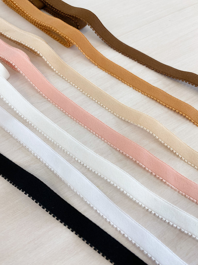 Our Plush Picot elastic is a bra making staple - soft, stretchy, and a perfect finish on bra bands, panties and other lingerie. This elastic is plush on one side with a decorative picot edge that shows from the front of your design. Custom-dyed in our core colours to match all of our supplies.