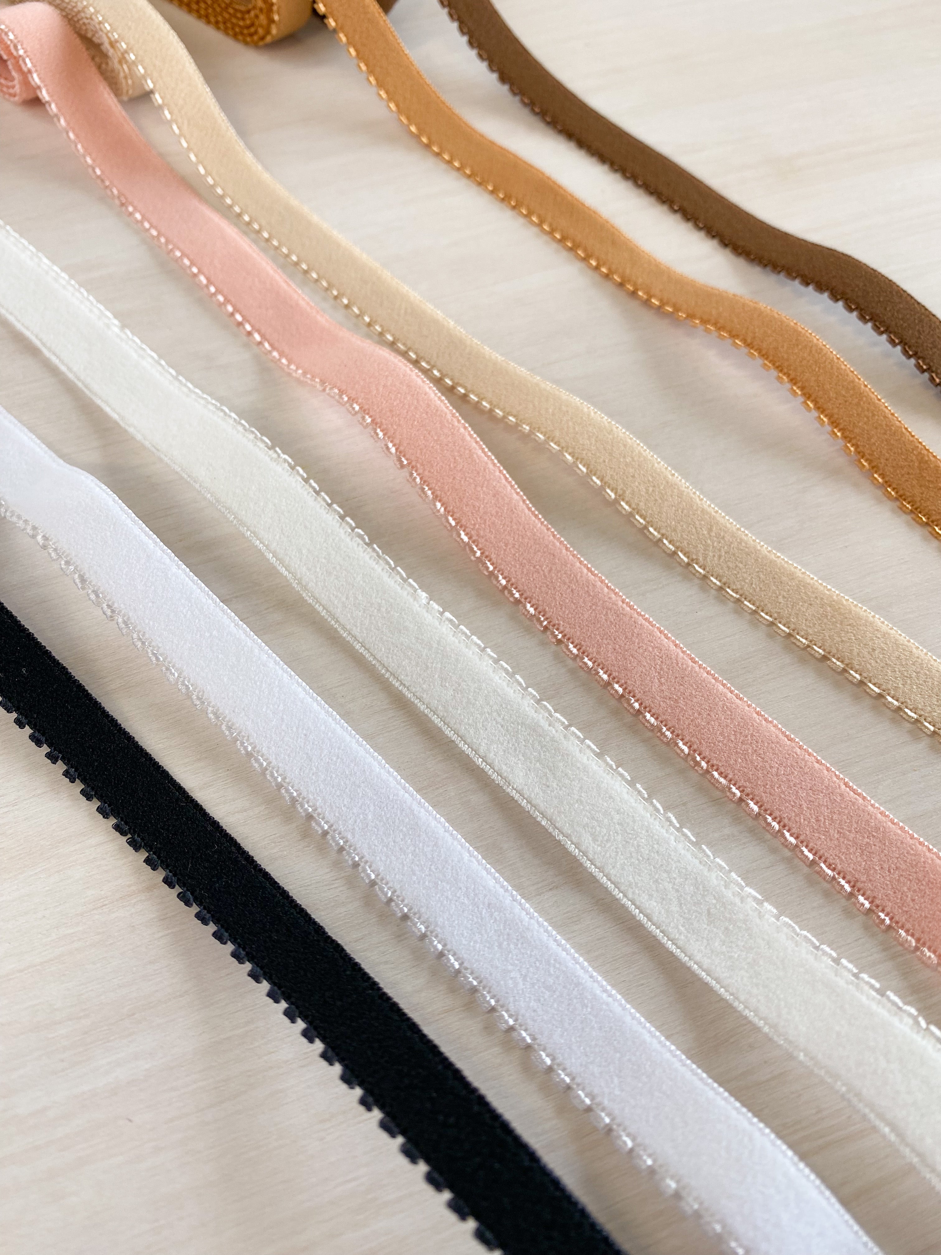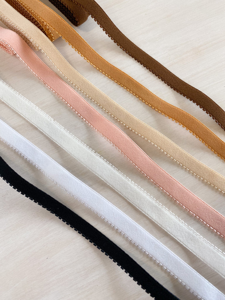 Our Plush Picot elastic is a bra making staple - soft, stretchy, and a perfect finish on bra bands, panties and other lingerie. This elastic is plush on one side with a decorative picot edge that shows from the front of your design. Custom-dyed in our core colours to match all of our supplies.