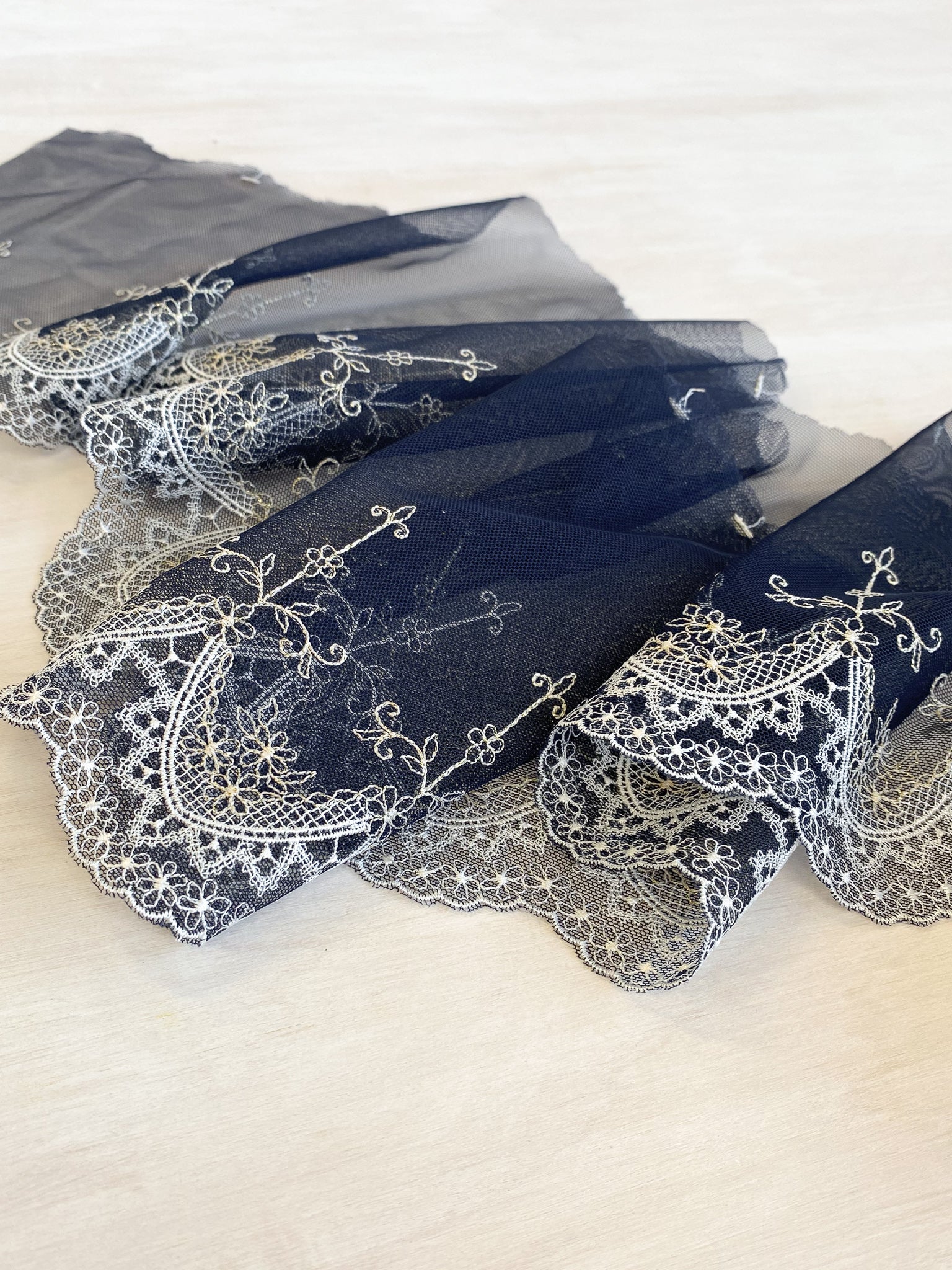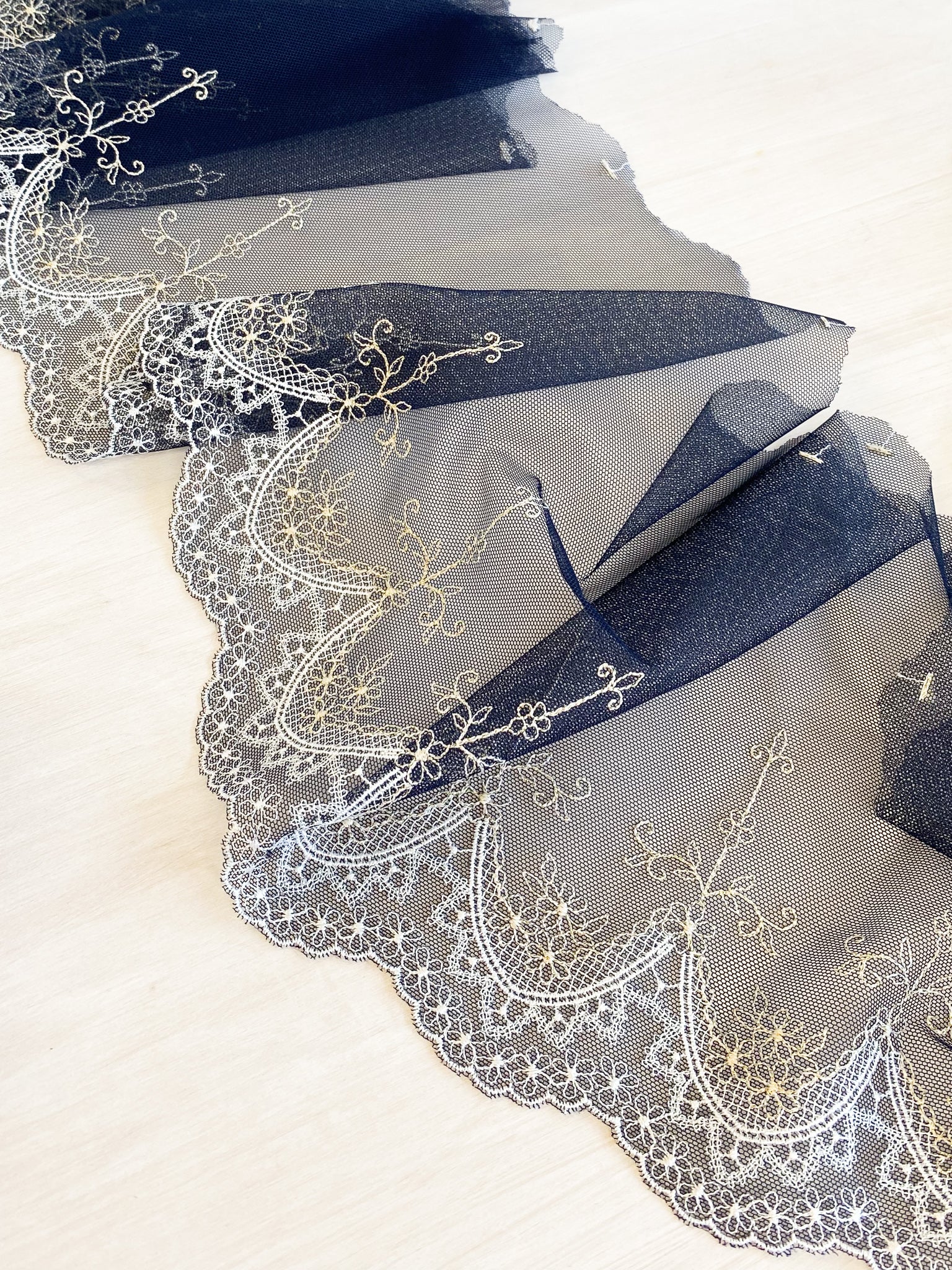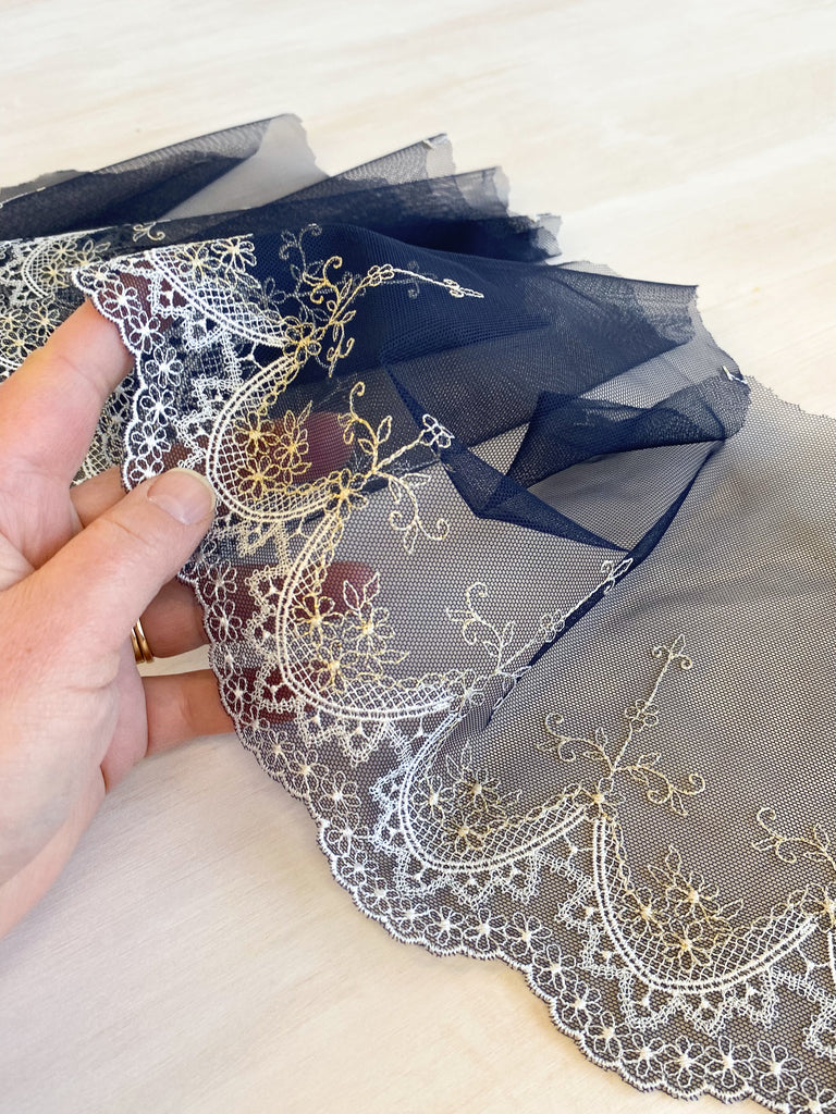 Camelot was named for the Castle from the King Arthur. This lace reminds me of Gothic arch windows and views over a fairytale landscape. It has a beautiful metallic thread running through the embroidered flowers which add to the magic.