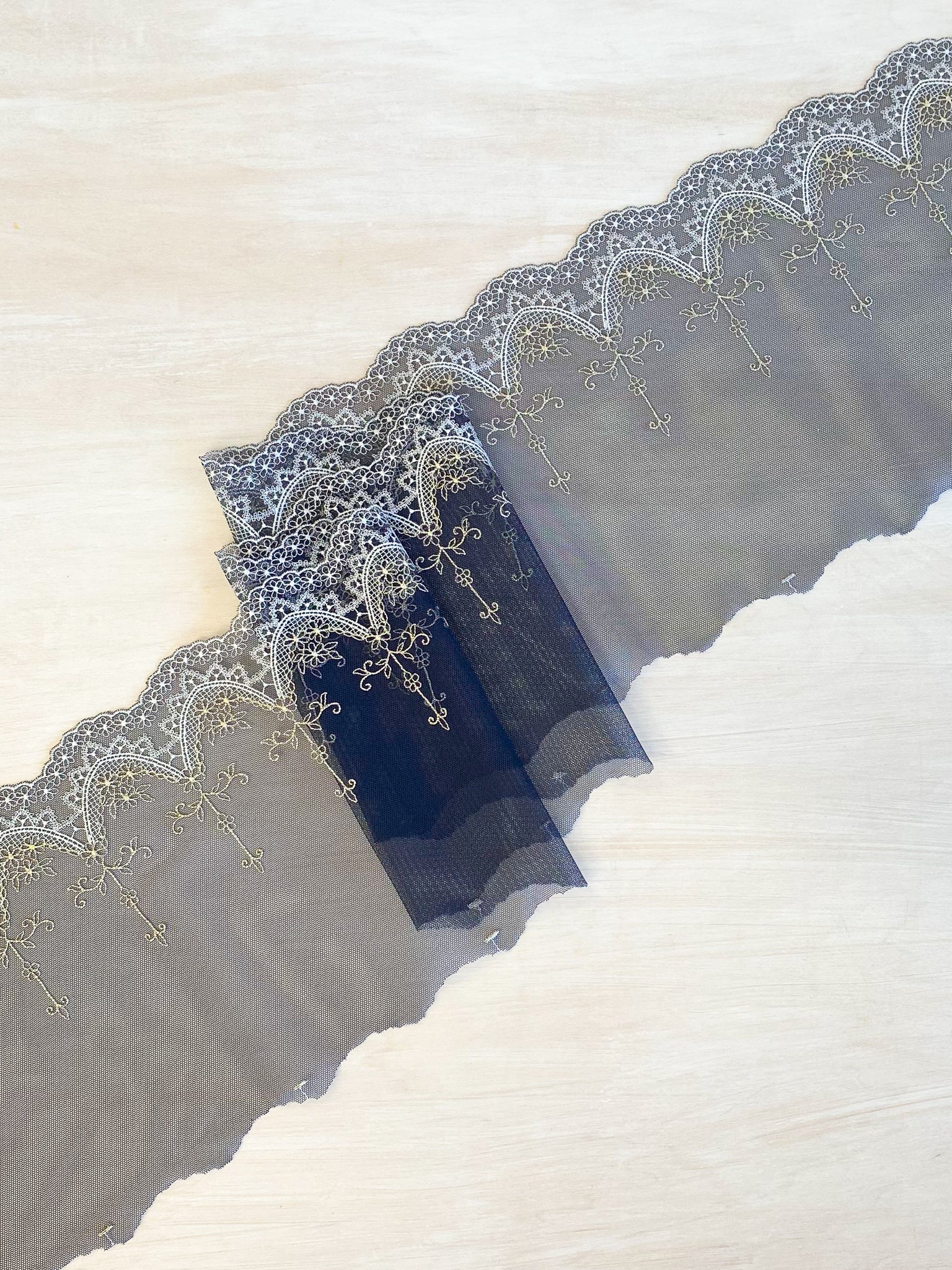 Camelot was named for the Castle from the King Arthur. This lace reminds me of Gothic arch windows and views over a fairytale landscape. It has a beautiful metallic thread running through the embroidered flowers which add to the magic.